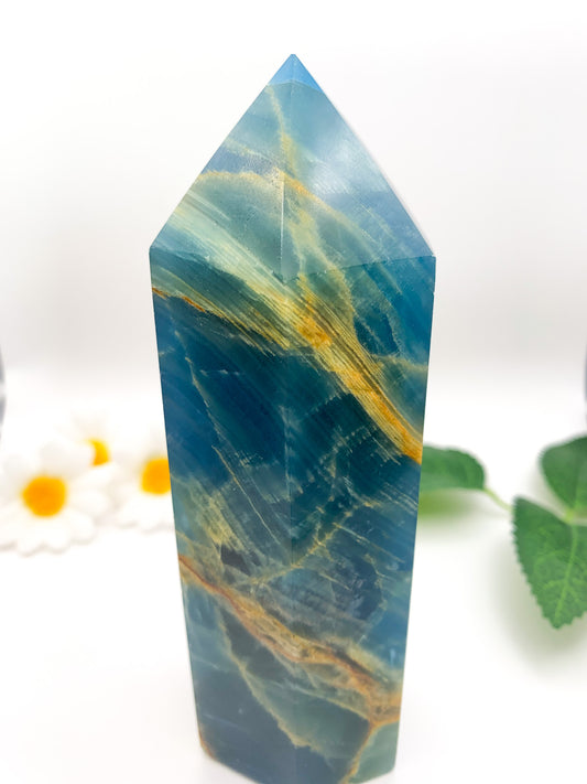 Lemurian Aquatine Calcite Tower/ Argentinian Blue Onyx (Rare)