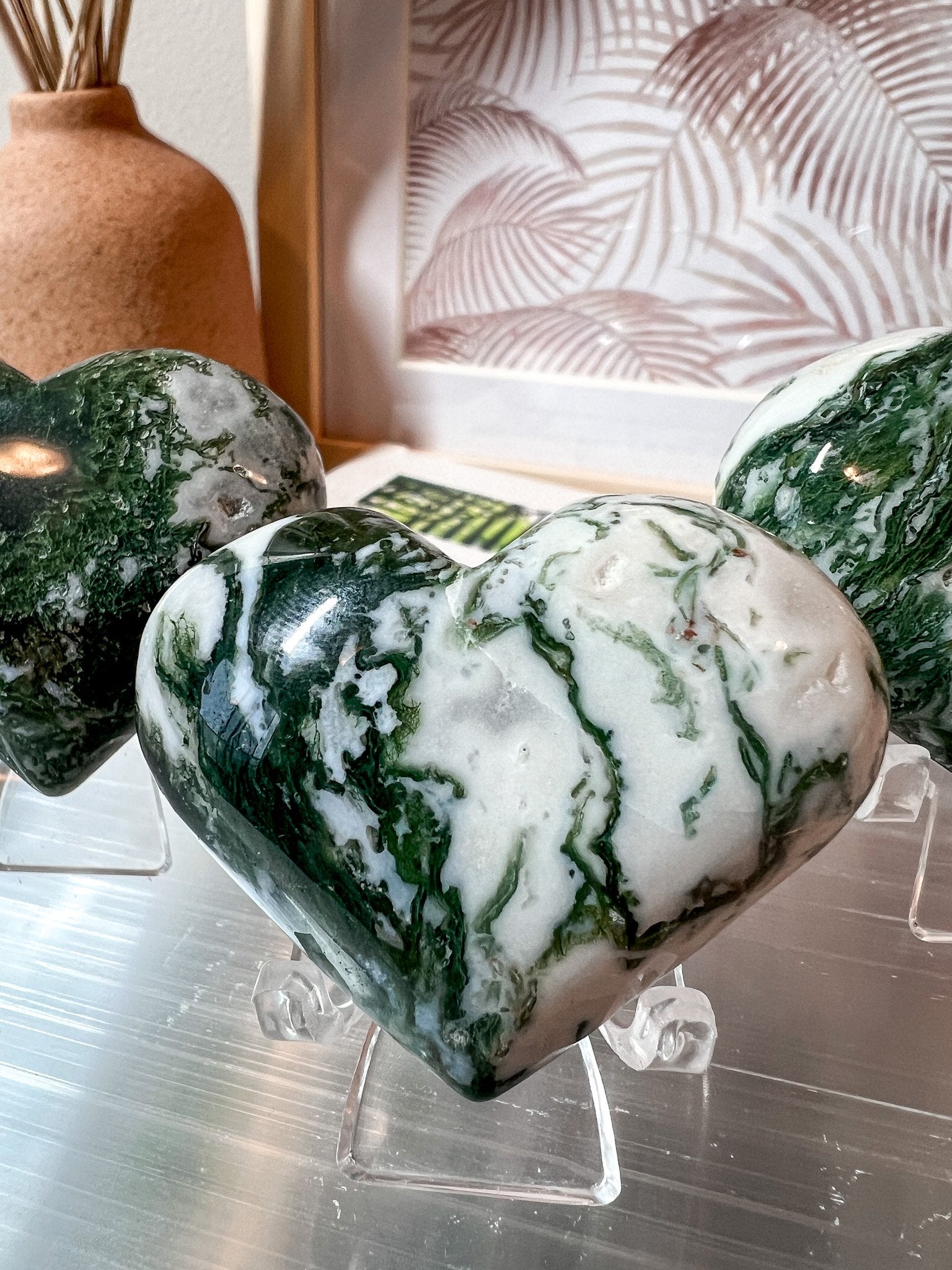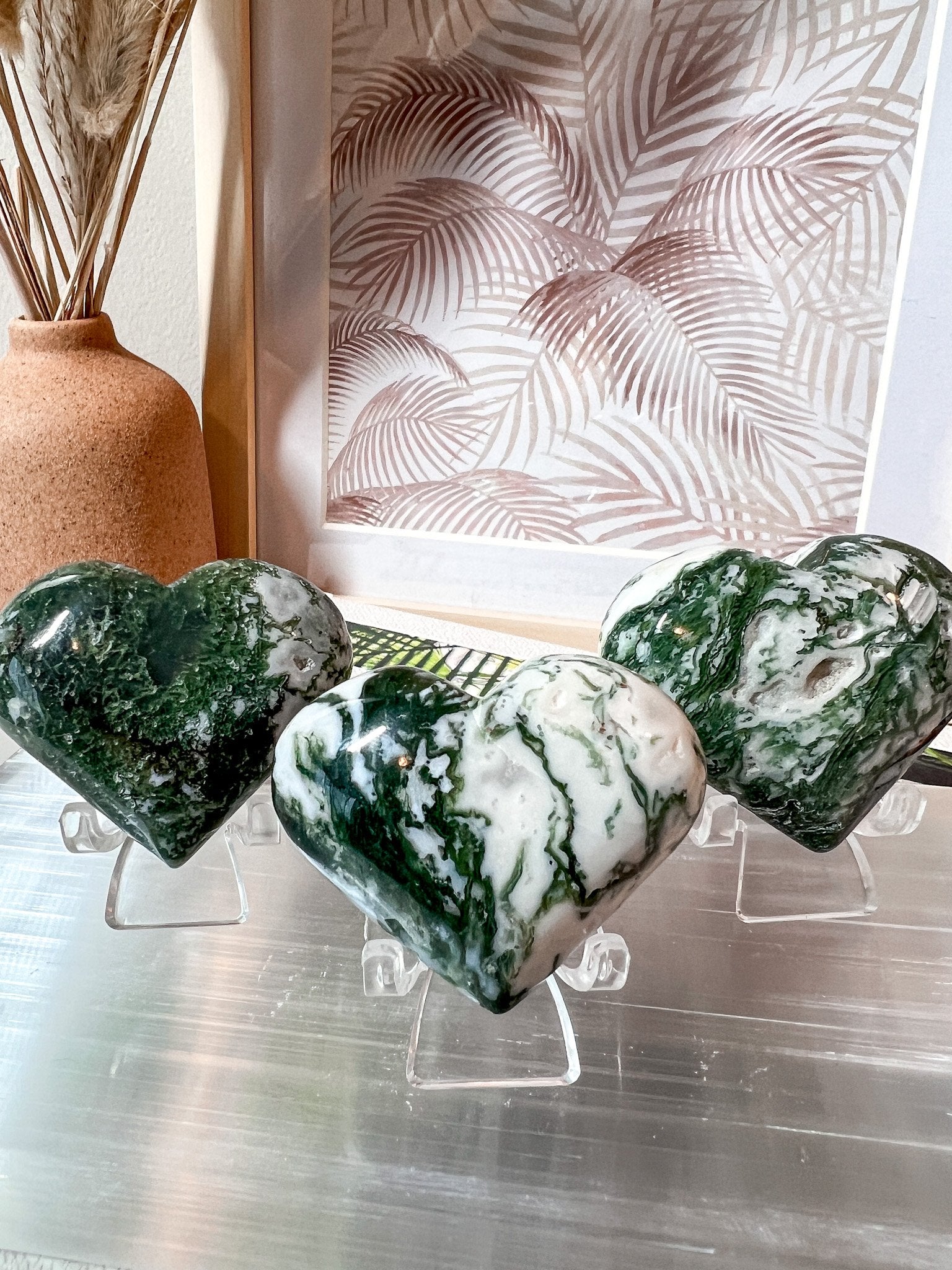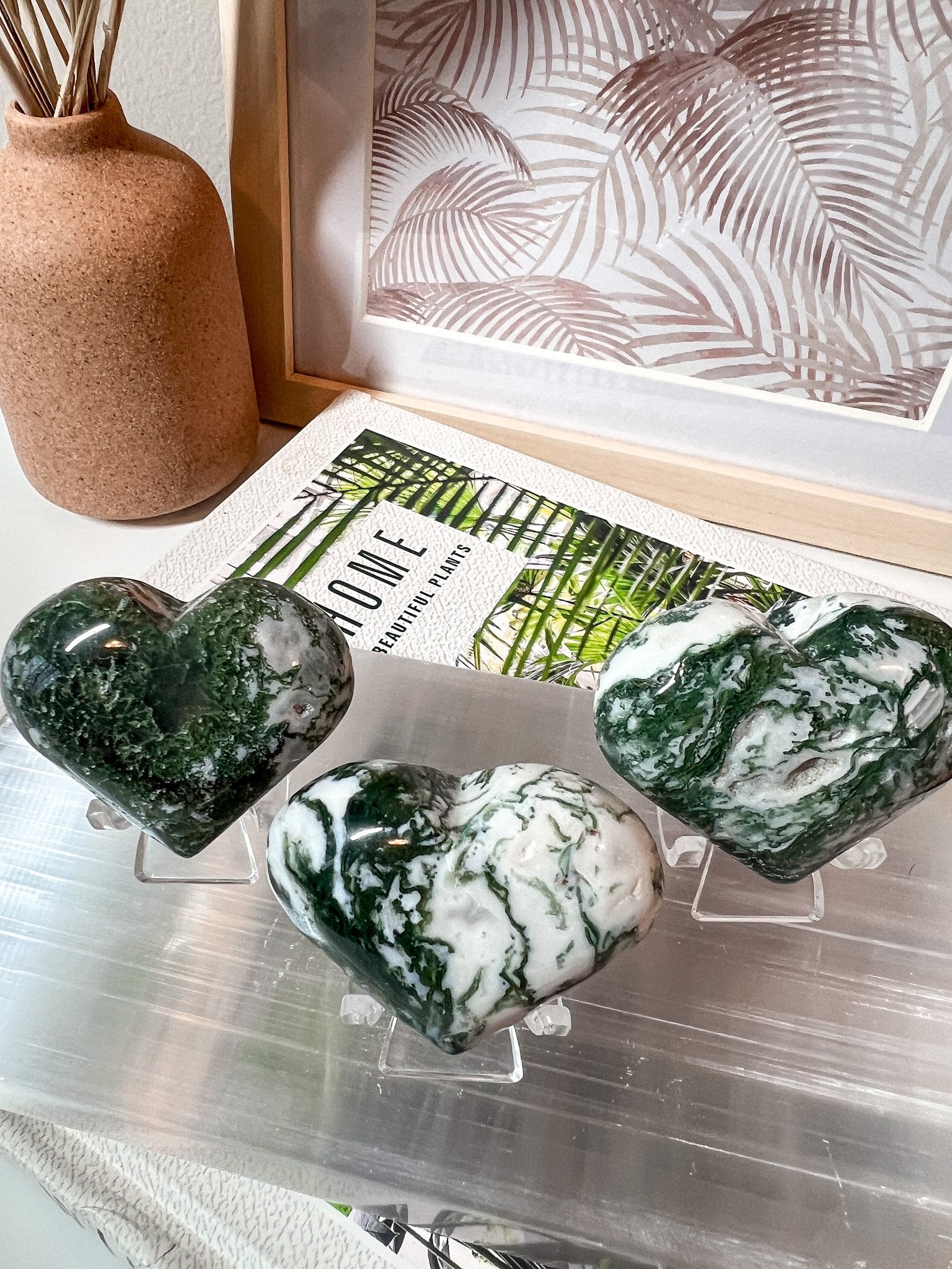 Formed from silicon dioxide, Moss Agate is a form of chalcedony. Working with the Heart Chakra it helps regulate our interaction with the world by giving us the ability to balance ourselves within our current environment. This energy is used to stabilize and resolve issues and blockages which will in turn, help us understand our emotions and needs more clearly.