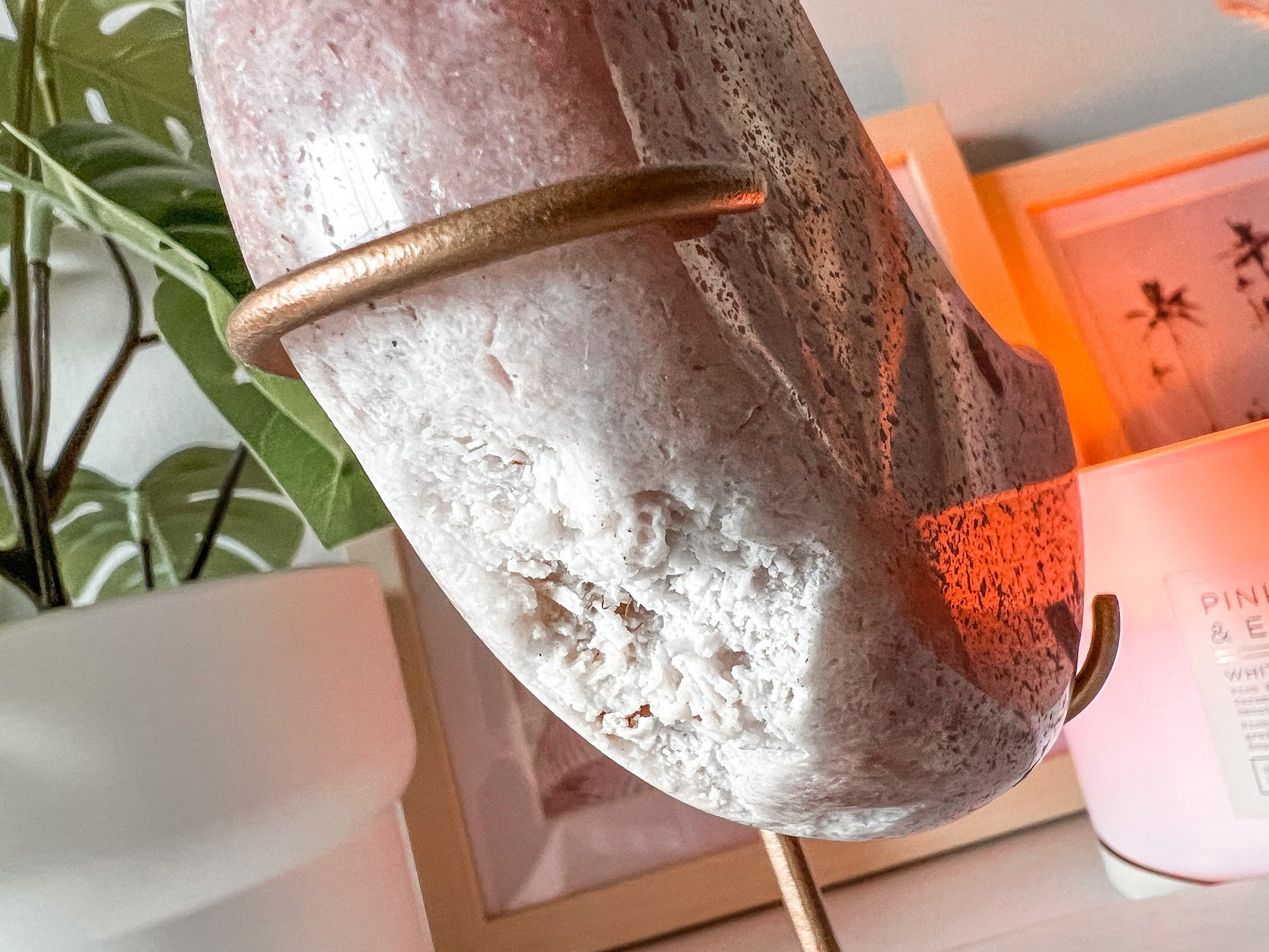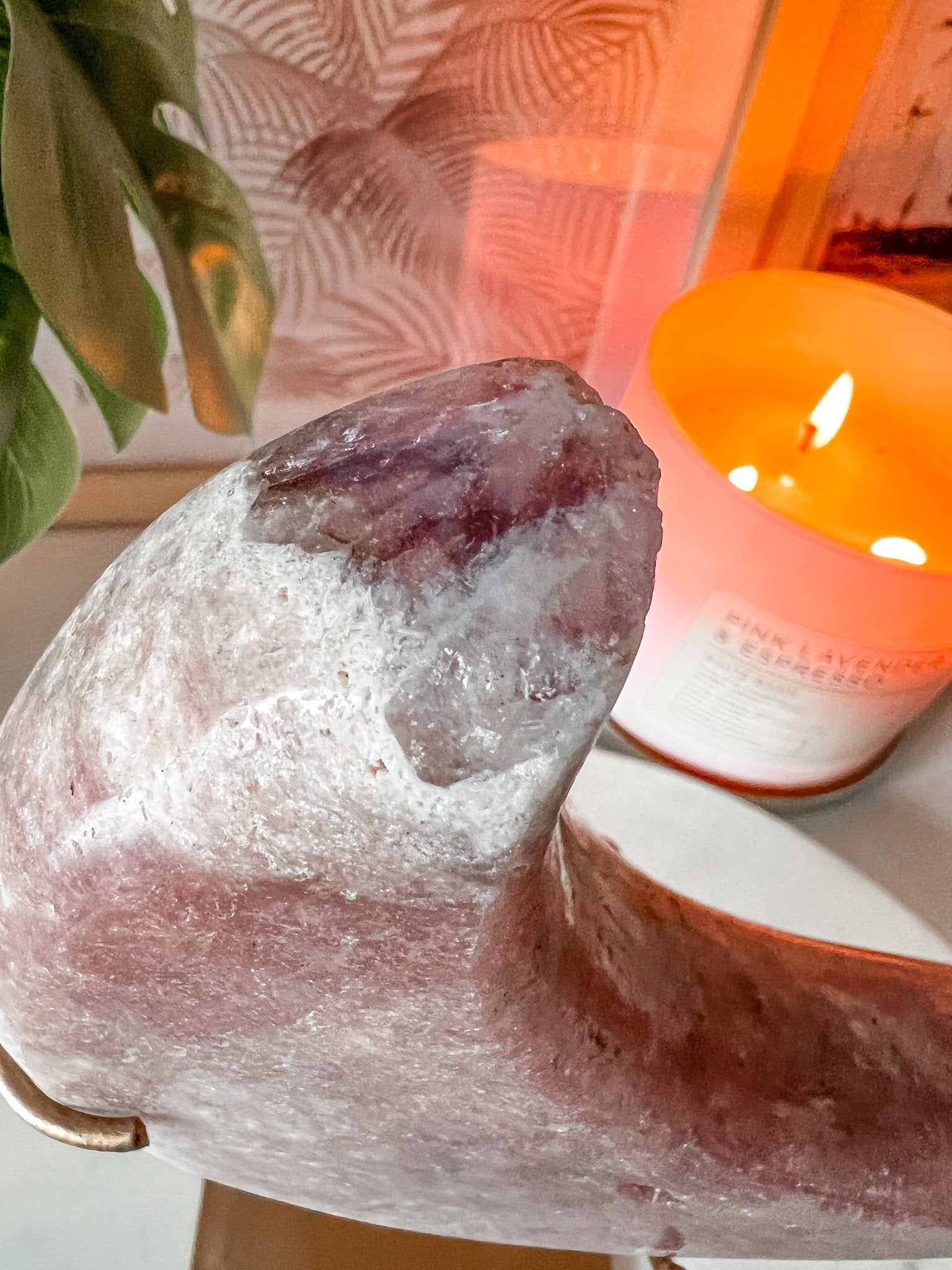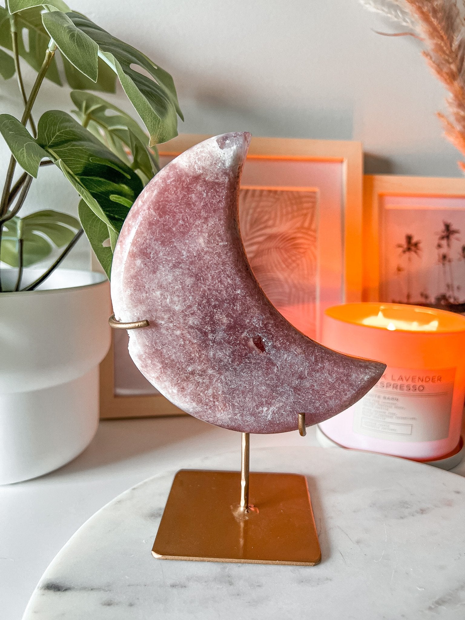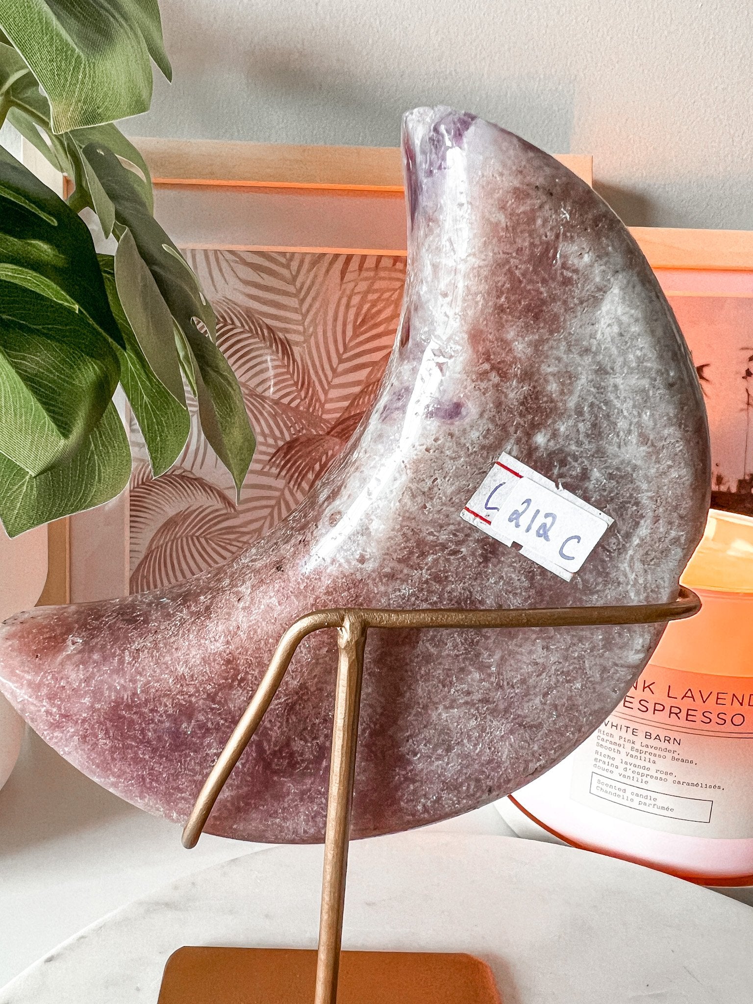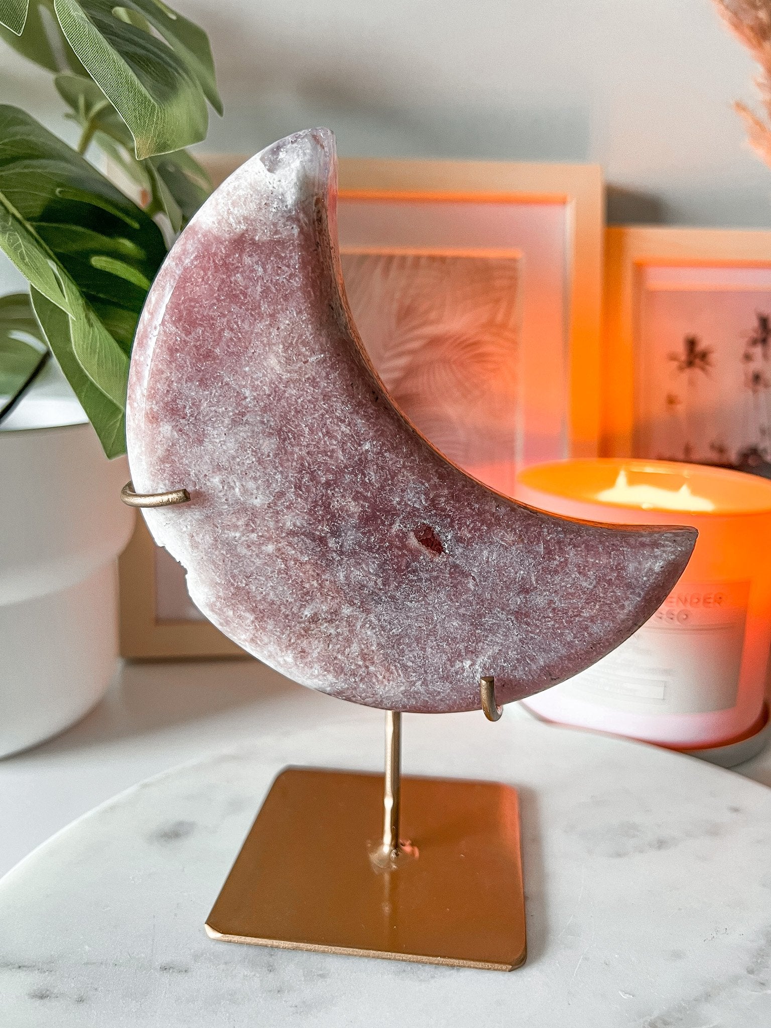 With its custom-made stand this Pink Amethyst Moon is perfect for adding a unique touch to any space and to bring a calming, loving  and serene atmosphere.